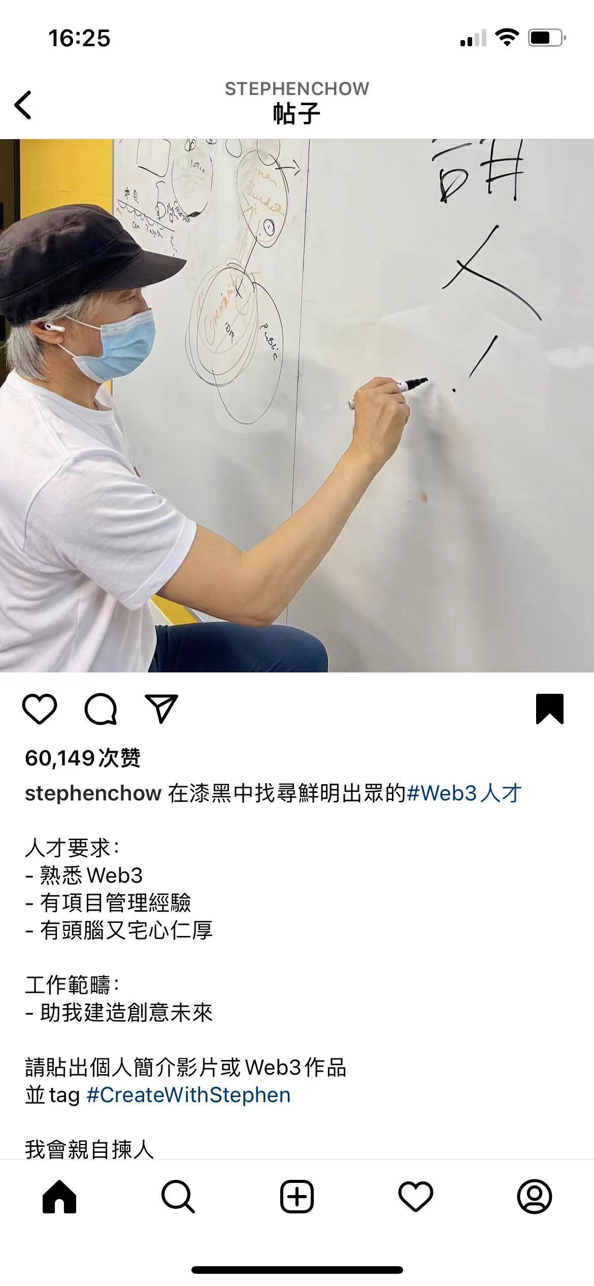 10月18日,中国香港明星周星驰将Instagram账号的首条动态献给了Web3.0。