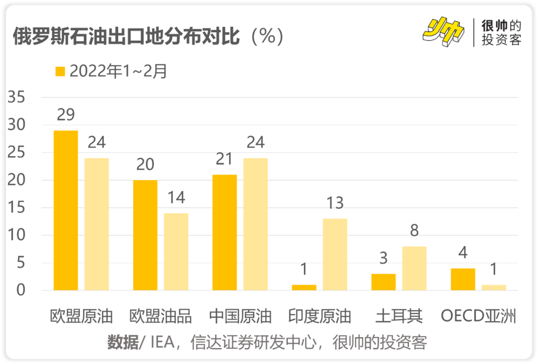 俄罗斯也没有坐以待毙:它一边明确表示,拒绝对参与制裁的国家出口石油;另一边暗中减少对欧洲市场的依赖,转而向中国、印度等地扩大出口。