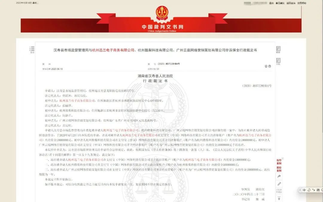 2020年4月,杭州迅兰电子商务有限公司涉嫌传销,被汉寿县人民法院冻结资金1千万元。申请人为汉寿县市场监督管理局。
