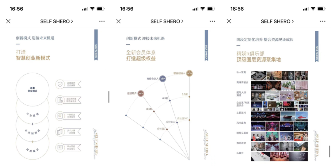 根据希柔服务号「SELF SHERO」 的介绍,希柔打造了一钟「智慧创业新模式」,即平台直销+会员制商城+微商模式。