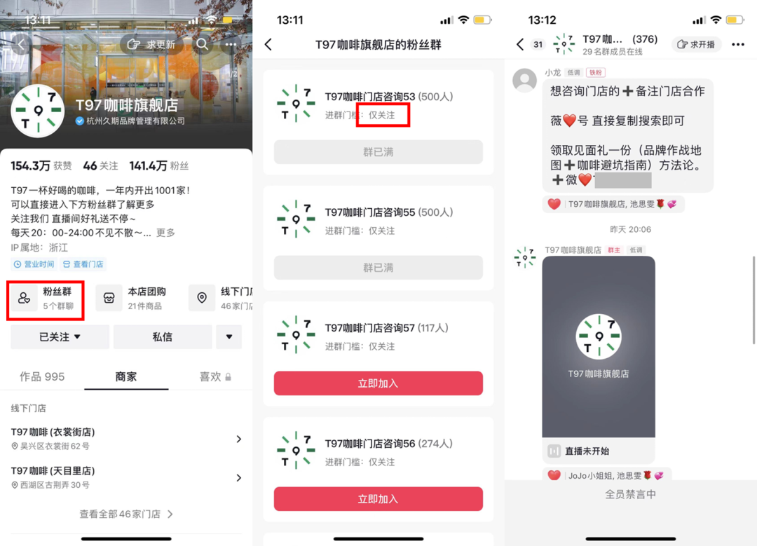 在T97咖啡旗舰店中,可以找到其粉丝群,命名为「T97咖啡门店咨询」群。进群门槛为「仅关注」。群内全员禁言,仅群主和管理员可以发言。