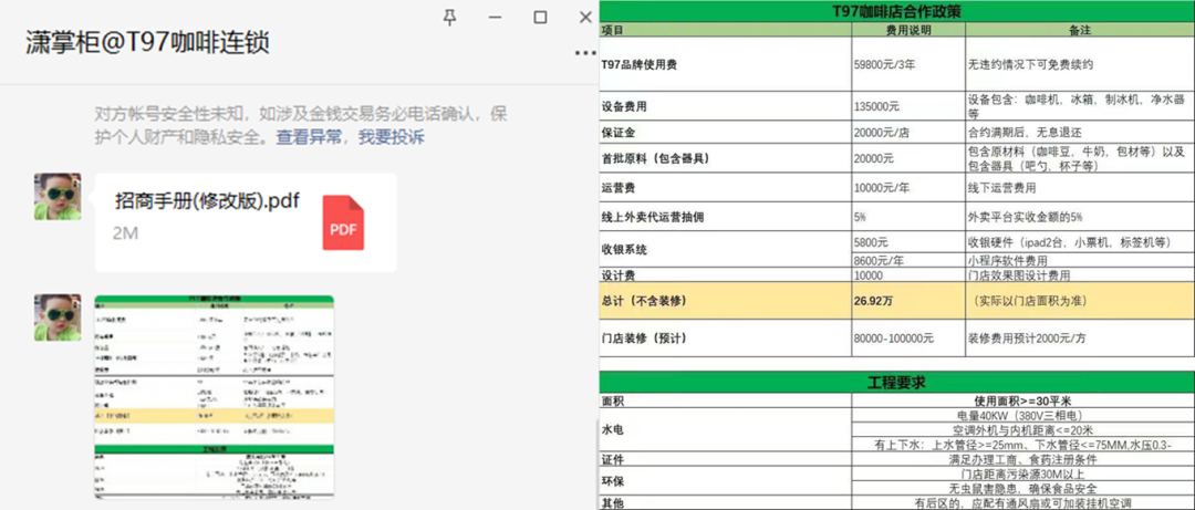 在其招商手册上写到,T97咖啡是被盗版最快的新锐国货品牌,上线不足一年就完成10亿销售额。合作政策显示,不含装修需要一次性投入26.92万元,其中,T97品牌使用费为5.98万元/三年。