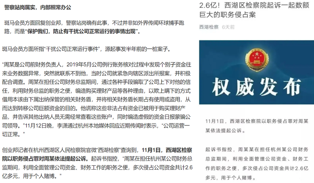 2020年双11,斑马会员宣称总成交额突破10亿元。同一天,媒体报道称,有警察在斑马浙商财富大楼下站岗,或与旧案有关。前财务负责人周某利用职务之便,多次侵占公司资金共计2.6亿多元,用于个人赌博。