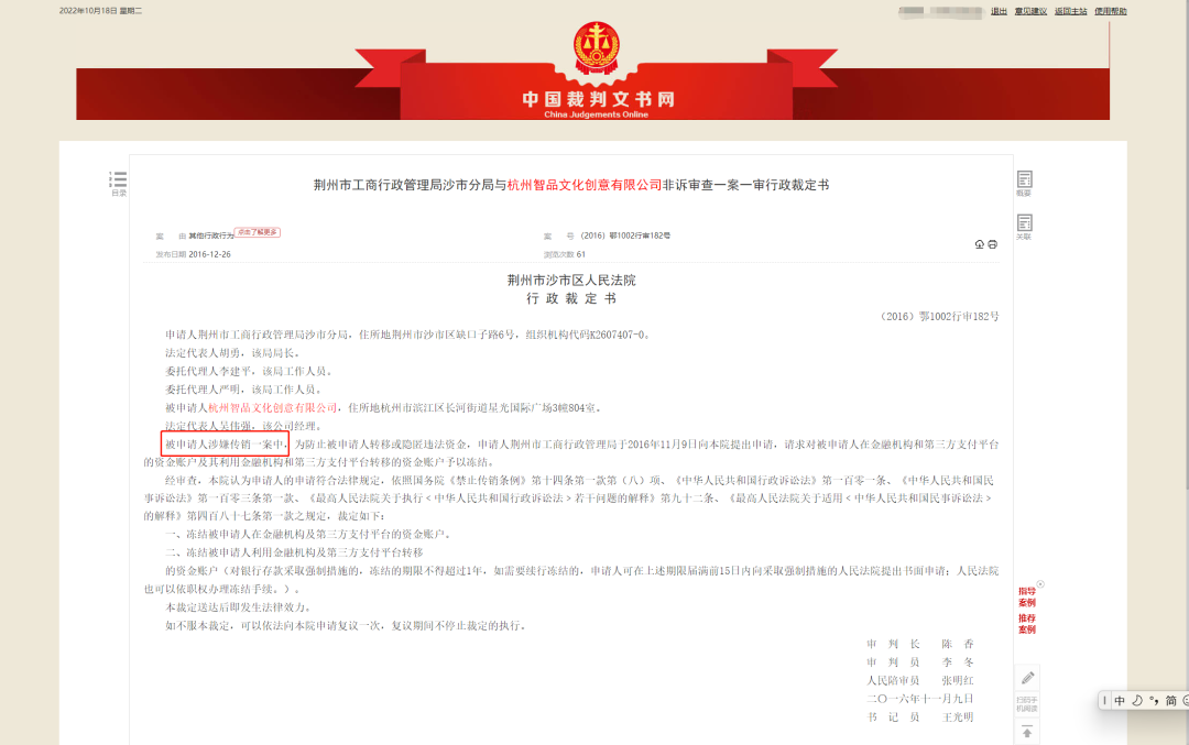 2016年11月,环球捕手微信公众号帐号运营主体,杭州智品文化创意有限公司因涉嫌传销,被荆州市沙市区人民法院裁定冻结账户。申请人为荆州市工商行政管理局沙市分局。