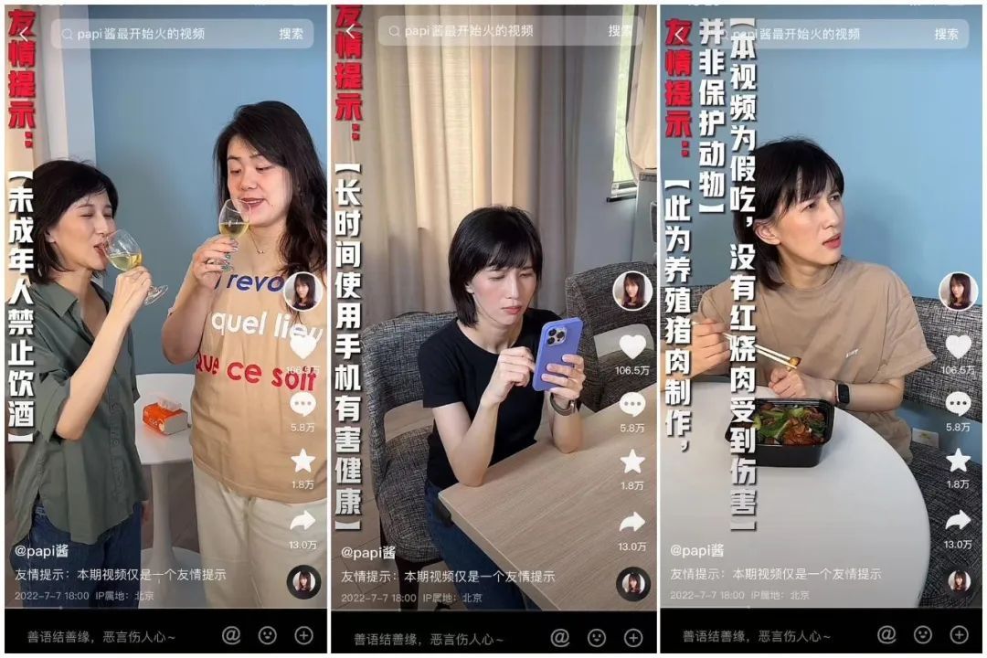 喝酒的镜头,要提示“未成年人禁止饮酒”,玩手机的镜头,要提示“长时间使用手机有害身体健康”,吃饭的镜头,要提示“此为养殖猪肉制作,并非保护动物”以及“此视频为假吃,没有红烧肉受到伤害”。