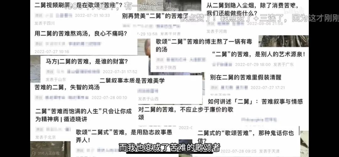 在不到12分钟的视频中,UP主用凝练冷峻但不失诙谐的语言叙述了二舅直面苦难的一生。无数年轻人将对二舅的情感投射到了自己对生活的迷茫、焦虑、抱怨中……也正因此,“二舅”出乎意料地走红了。