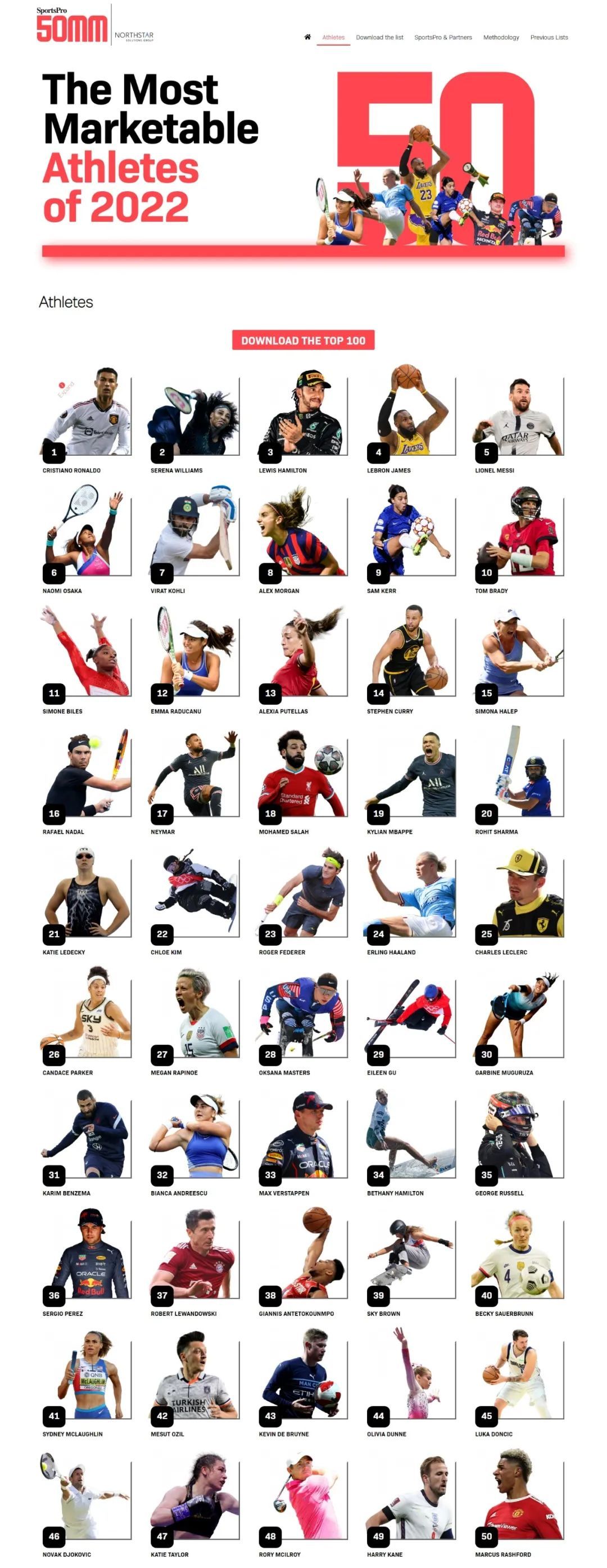 近日,英国体育数字媒体Sportspro公布了2022年最具市场价值运动员TOP50榜单。