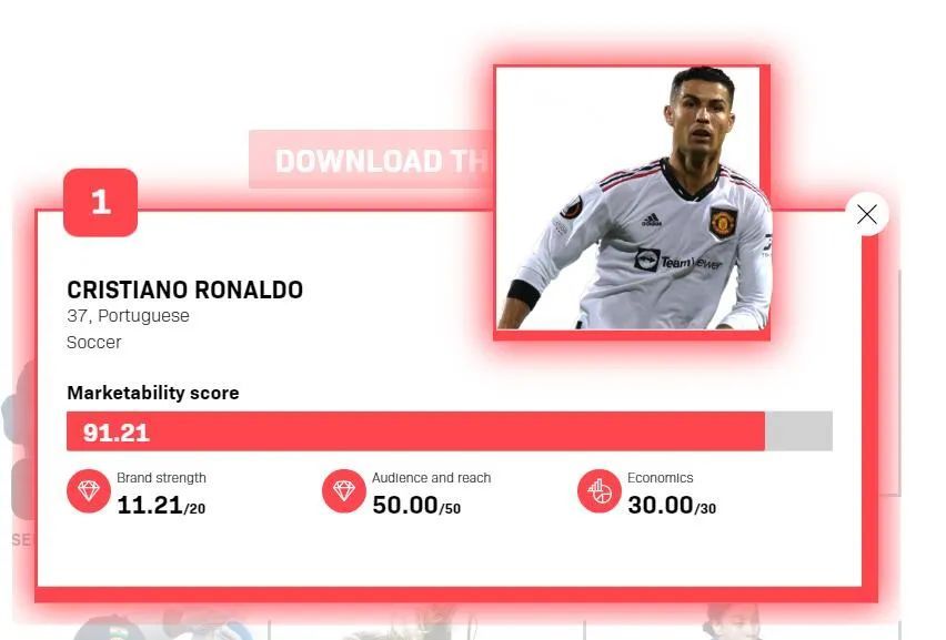 C罗的市场价值得分为91.21分,领先第二名的小威(67.99分)超过20分,领先第五名的梅西(53.27分)接近40分之多。虽然C罗的竞技状态开始走下坡路,但他的赞助商数量、社交媒体粉丝数量、媒体曝光率等场外综合影响力远超其他人。尤其是他的社交媒体平台运营能力堪称全球体育界第一,比如,单单他的Instagram粉丝数量就超过4.81亿人。