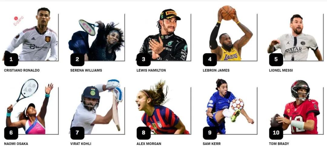 其中,足球巨星C罗(克里斯蒂亚诺-罗纳尔多)位列榜首,女子网球选手小威位列第二,F1车手汉密尔顿排名第三。进入前十名的选手依次是:1、C罗(足球选手),2、小威(女子网球),3、汉密尔顿(F1赛车),4、詹姆斯(篮球),5、梅西(足球),6、大坂直美(女子网球),7、维拉-科利 (Virat Kohli,印度板球选手),8、阿莱克斯-摩根(女子足球),9、萨姆-科尔(女子足球),10.汤姆-布雷迪(橄榄球)。