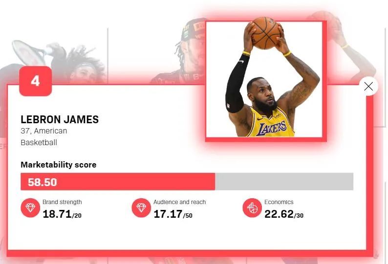 最具市场价值运动员榜单由Sportspro和大数据方案解决公司NorthStar联合评选,今年已经是连续第13年发布,今年对全球超过700名符合标准的知名运动员进行了数据追踪和评估。该榜单根据运动员的“市场价值得分”的分值高低进行排名,总分100分,其中三个一级指标分别是运动员的个人实力、受众触达、经济效应。同时,在评估过程中还将运动员的社会影响力、公益事业投入程度等纳入了评估指标。这些指标基本涵盖了运动员在赛场内外的综合影响力。