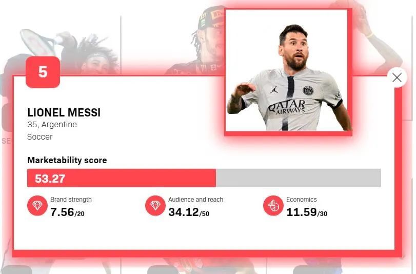 入选前50的17位足球运动员分别是:C罗(第1)、梅西(第5)、阿莱克斯-摩根摩根(第8)、萨姆-科尔(第9)、亚历克西娅-普特利亚斯(13)、内马尔(17)、萨拉赫(18)、姆巴佩(19)、哈兰德(24)、拉皮诺埃(27)、本泽马(31)、莱万(37)、贝基-索尔布鲁恩(40)、厄齐尔(42)、德布劳内(43)、凯恩(49)、拉什福德(50)。在今年这个世界杯年份,足球选手的商业价值注定将会进一步被放大。如果在年底统计这份榜单,或许会有更多足球选手入选。