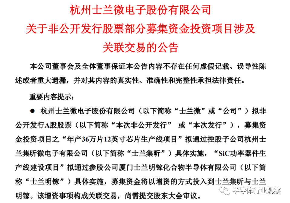 10月14日,士兰微披露再融资预案,65亿元募集资金将用于SiC功率器件生产线等项目的建设。公告显示,SiC功率器件生产线建设项目投资总额为15亿元,在士兰明镓现有芯片生产线及配套设施的基础上,通过购置生产设备提升SiC功率器件芯片的产能,用于生产SiC MOSFET、SiC SBD 芯片产品;项目达产后,将新增SiC MOSFET芯片12万片/年、SiC SBD芯片2.4万片/年的生产能力。