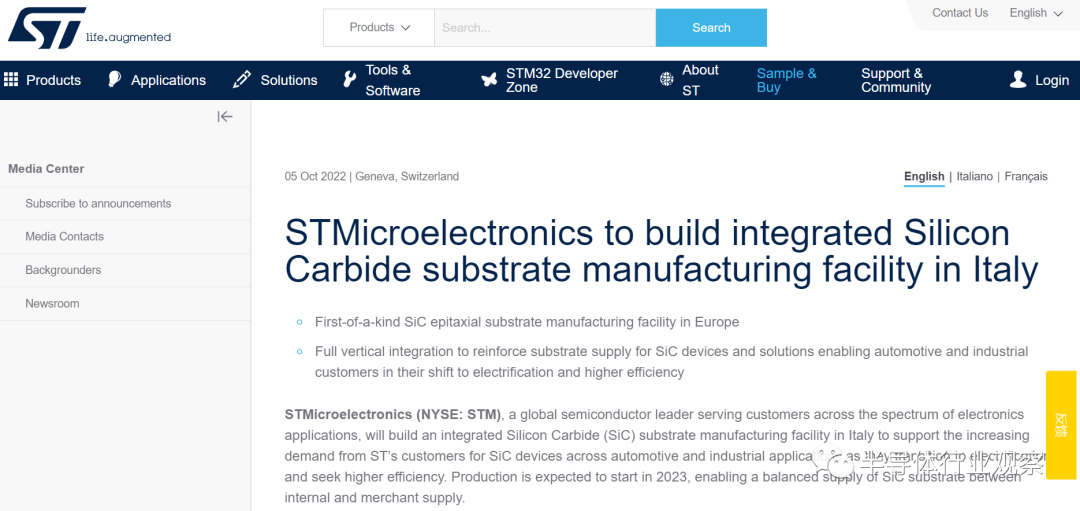 意法半导体则是选择建设SiC衬底工厂。10月5日,意法半导体宣布,将在意大利卡塔尼亚新建一个SiC衬底工厂,以满足客户对汽车和工业应用对 SiC 器件日益增长的需求随着他们过渡到电气化并寻求更高的效率,借此实现意法半导体40%碳化硅衬底的自主供应,新工厂预计将于2023年开始生产。