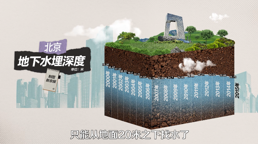 没水喝怎么办?只能从地下找。 从1999年起,地下水超采就成了平常事,北京年均超采5亿立方米,2005年之后,只能从地面20米之下找水了,这直接导致了我们开头说的地面沉降。