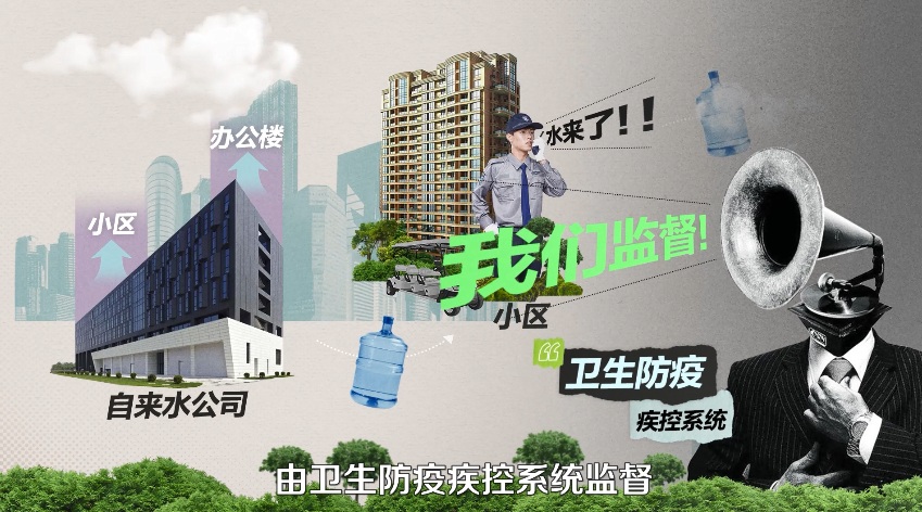 城市里的水,兹事体大,所以有一堆人管理。 自来水公司负责分配各个小区、办公楼的自来水,小区物业负责小区内的自来水管理,自来水水质由卫生防疫疾控系统监督。
