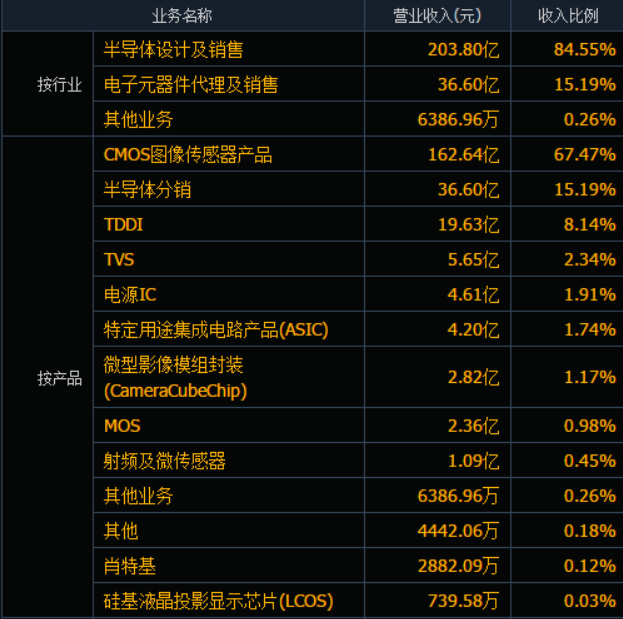 当然,并购普通芯片公司,还不能让韦尔脱胎换骨,直到2017年上市之前,韦尔仍是一家外界眼中的“分销商”。公司电子元器件分销业务营收16.75亿元,占比69.9%;半导体设计营收7.21亿元,占比30.1%。