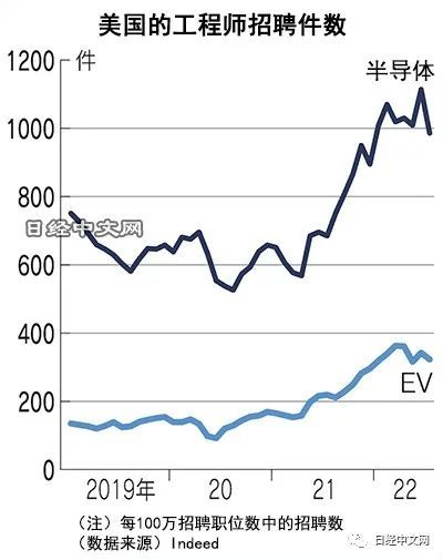 通过美国招聘搜索服务“Indeed”查询工程师的招聘动向,在美国,每100万招聘职位数中的半导体领域招聘数2022年7月比2019年7月大幅增加64%,纯电动汽车领域则达到2.6倍。