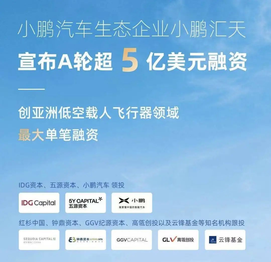 2020年,承载了何小鹏飞车梦的小鹏汇天正式成立,2021年10 月,小鹏汇天完成超5亿美元A轮融资,投前估值10亿美元,创下亚洲飞行汽车领域的融资纪录。