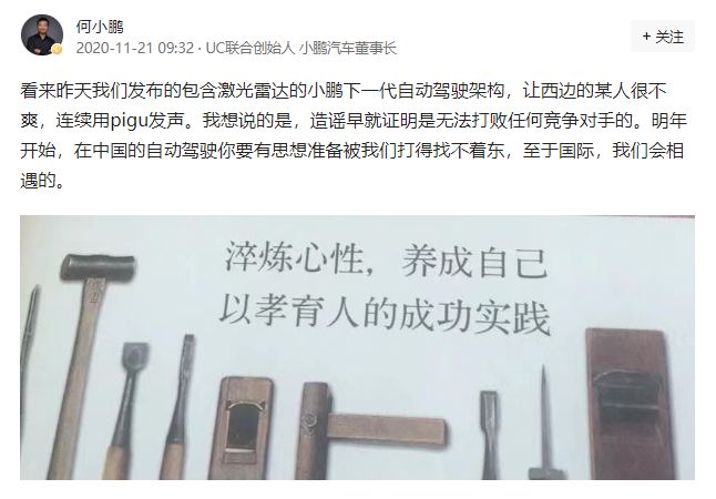 2018年的一次采访中,何小鹏被问及和马斯克之间的差距,他不卑不亢地表示:“现在他比我厉害,未来我可能比他厉害”。