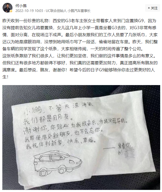 10月19日,何小鹏在个人社交账号分享了一张纸巾留言,被配文称,一位小鹏G3老车主老门店置换新车G9,车主女儿“对G3非常有感情,面对分离,在现场泣不成声”。而纸巾上,则是由小女儿手写的对于小鹏G3的感谢话语。