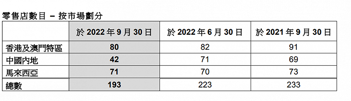 截至9月30日,莎莎国际旗下零售店共193家,对比去年同期233家,一年内减少40家。其中,香港及澳门地区减少11家,内地减少27家。