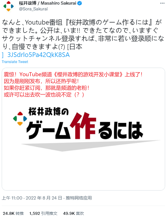 8 月 24 号那天,知名游戏制作人樱井政博,突然发了条推特。