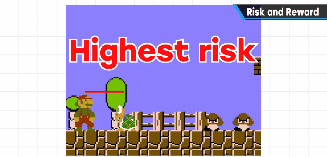 另一个,就是用龟壳刷分的风险。小时候玩过《 超级玛丽 》的人都知道,龟壳碰到墙壁就会反弹,转头对玩家造成威胁;