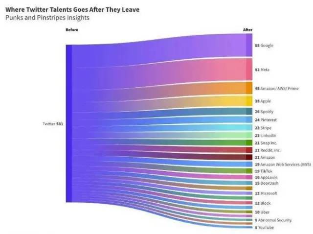 分析LinkedIn上的数据,美国网站Punks&Pinstripe的统计结果显示,在过去的3个月中,大约有530名员工离职,较上个季度增加了60%。就在本月,又出现近50名员工离职。目前,这些离职员工也正成为谷歌、苹果、亚马逊以及Meta等科技巨头争抢的目标。