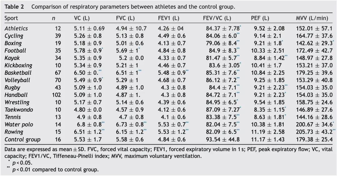 在另一项发表于2015年的研究中,对比了15个项目的运动员,赛艇运动员的最大自主通气量排名第一。