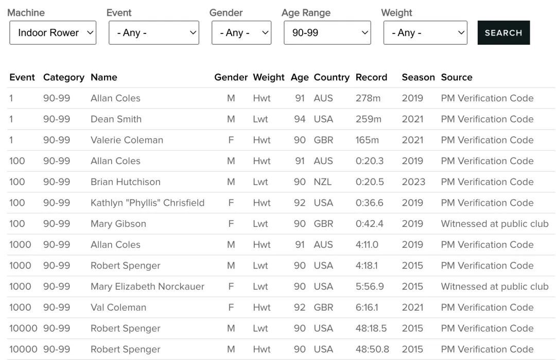 根据 Concept 2 官网比赛数据,90岁以上的老人参与人数并不少。