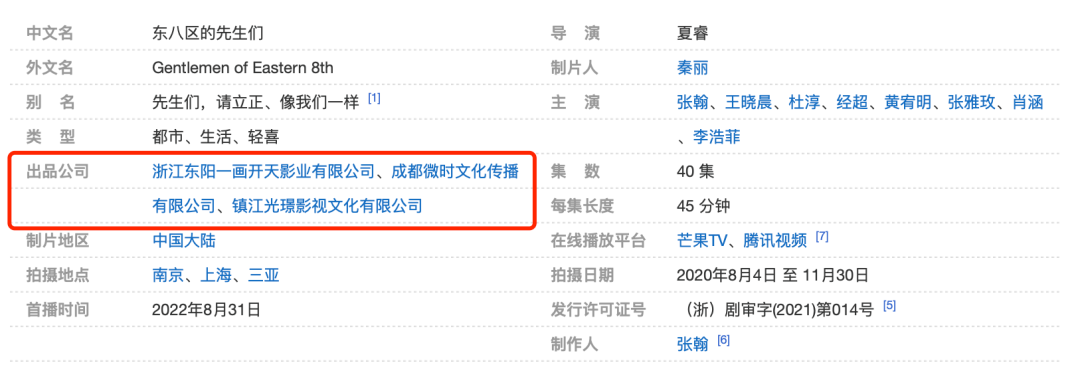 公开渠道中,已经很难找到《东八区的先生们》与百纳千成的直接联系。从某平台上介绍该剧的词条到官方微博的介绍,都无法直接找到百纳千成的影子。词条上,出品方写的是浙江东阳一画开天影业有限公司、成都微时文化传播有限公司、镇江光璟影视文化有限公司。