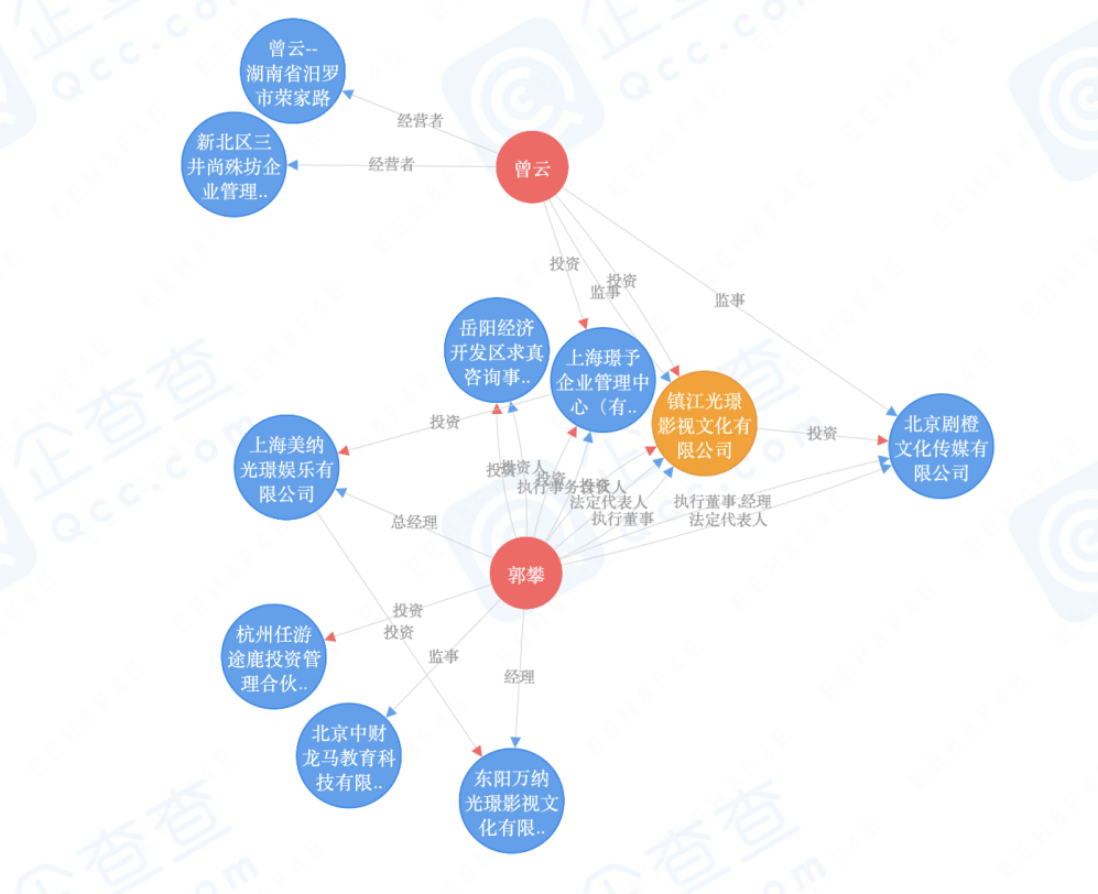企查查显示,镇江光璟影视文化有限公司的实际控制人为郭攀,大股东郭攀持股比例80%,曾云持股20%。而郭是上海美纳光璟娱乐有限公司的总经理,最终收益股份32%,这家公司的大股东则是北京百纳千成影视股份有限公司。