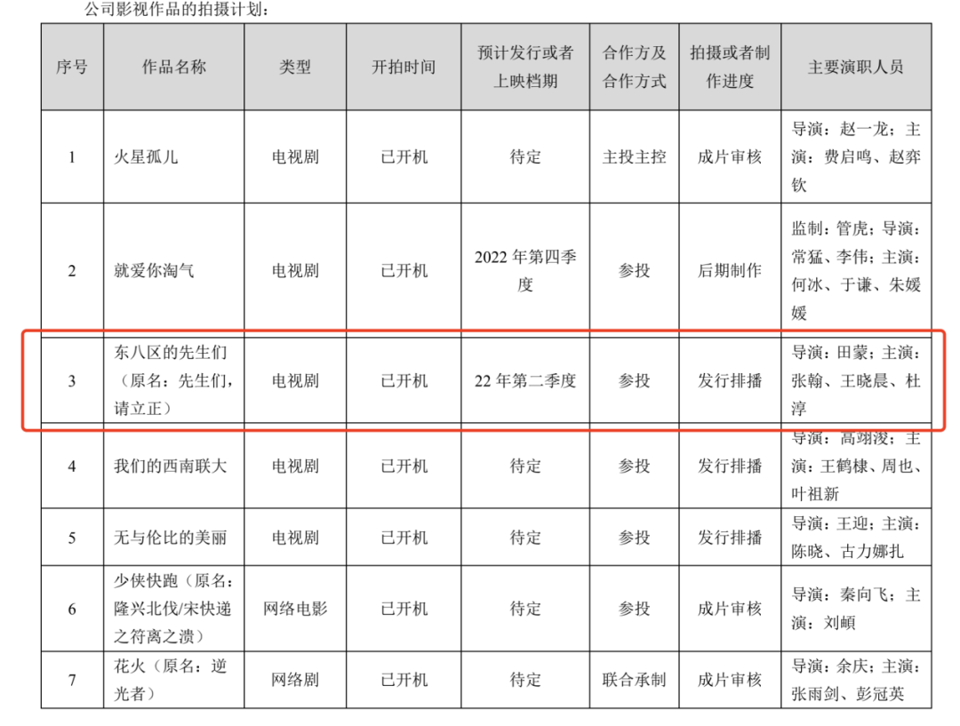 2022年4月,华录百纳(现改名为百纳千成)发布的财报显示:已拍摄完成进入后期制作阶段的项目有《我们的西南联大》《无与伦比的美丽》《东八区的先生们(原名:先生们,请立正)》《火星孤儿》《蜂鸟行动》等。同时,在2022年拍摄计划中,将《东八区的先生们》排在了第三,合作方式为参投。