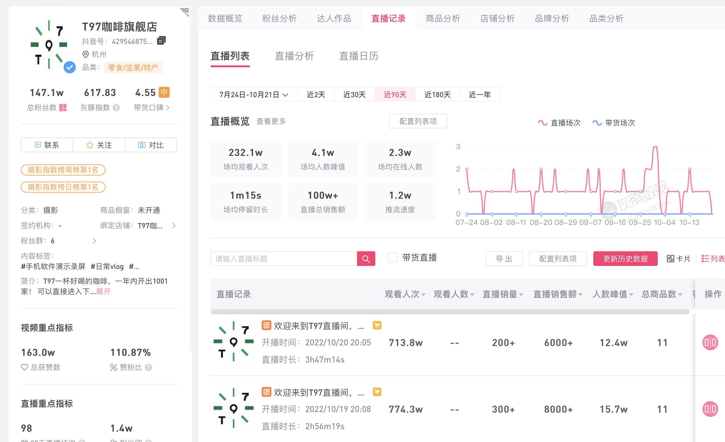 与周杰伦的带货力相比,T97最近制造的大IP“大嘴妹”带货力虽谈不上多么夸张,但为品牌引来的流量也是十分惊人。近30天新增粉丝126.9万,近90天直播的场均观看人次有232.1万,最高时达到过1000万以上,带货额总计100万+。