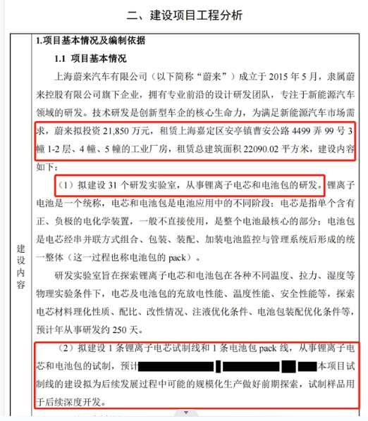 虽然环评公示中部分内容被隐藏,但从其内容来看,蔚来的这个研发项目已经覆盖了从原料到电芯生产再到检验检测的全过程,若研发项目顺利开展,也意味着蔚来具备了电芯生产的能力,在条件成熟之时即可自建电池厂生产电池电芯。