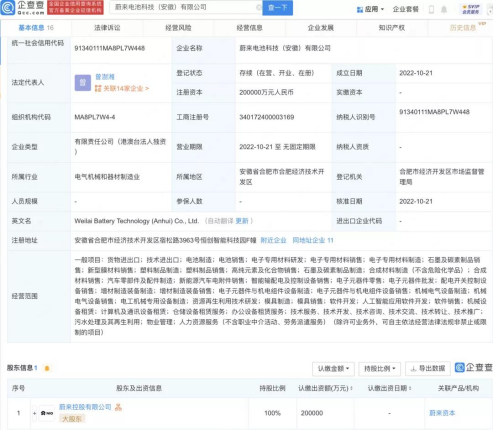 工商信息显示,蔚来电池科技经营范围涉及电池制造;电池销售;电子专用材料研发;电子专用材料销售;电子专用材料制造;石墨及碳素制品销售;新型膜材料销售;塑料制品制造;塑料制品销售;高纯元素及化合物销售;石墨及碳素制品制造;汽车零部件及配件制造;新能源汽车电附件销售等。