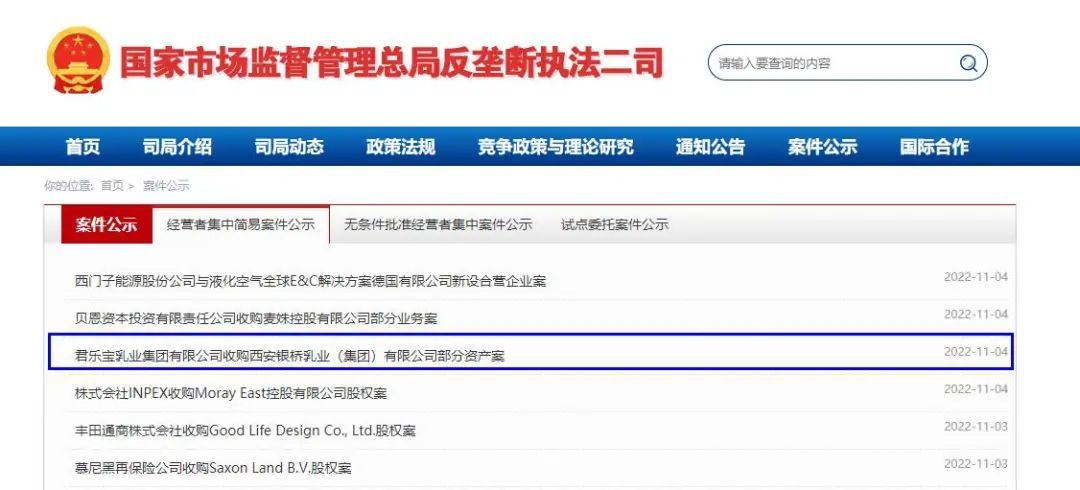 11月4日,国家市场监督管理总局反垄断执法二司公示了君乐宝收购银桥乳业部分资产案,公告显示:君乐宝乳业集团有限公司收购西安银桥乳业(集团)有限公司部分资产案正在进行经营者集中简易案件公示。这标志着君乐宝收购陕西银桥乳业最终确认,其审批环节已走到反垄断部门。