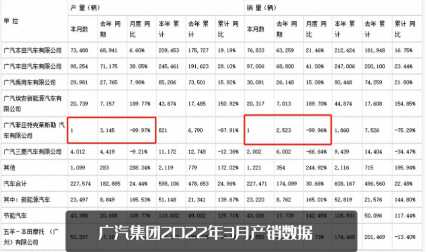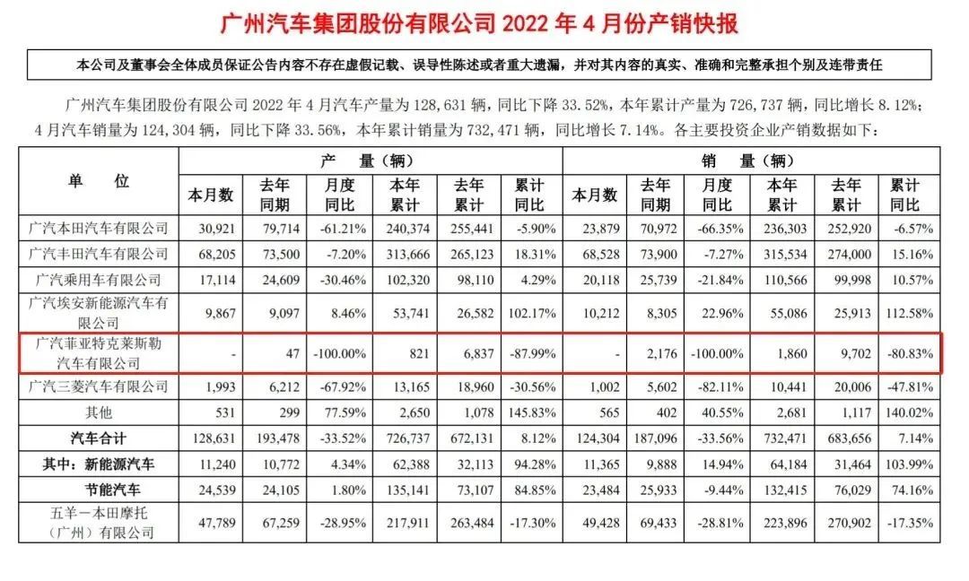 广汽集团对外发布了4月产销快报,广汽菲克那一栏, 产销数值全部显示为负数, 可见于广汽而言,广汽菲克已经成了拖后腿的存在。