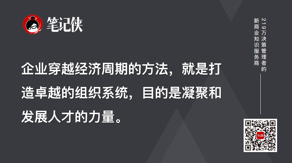综上所述,我们结合两位专家的观点,找到了让企业穿越经济周期的方式,就是打造卓越的组织系统,目的是凝聚和发展人才的力量。