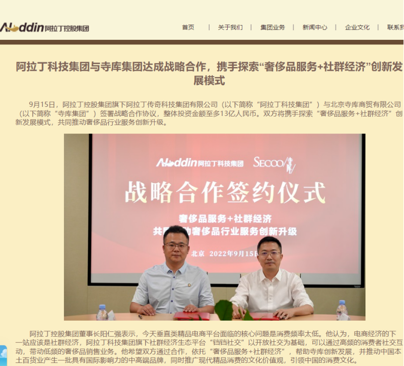 按照阿拉丁科技集团的说法,双方将“携手探索‘奢侈品服务+社群经济’创新发展模式”。寺库创始人、董事长李日学彼时现身签约现场。李日学表示,“寺库集团成立14年来,致力于为消费者提供‘精品生活方式平台’,坚持用户利益高于一切。”根据协议,阿拉丁科技集团对寺库的整体投资金额至多13亿元。