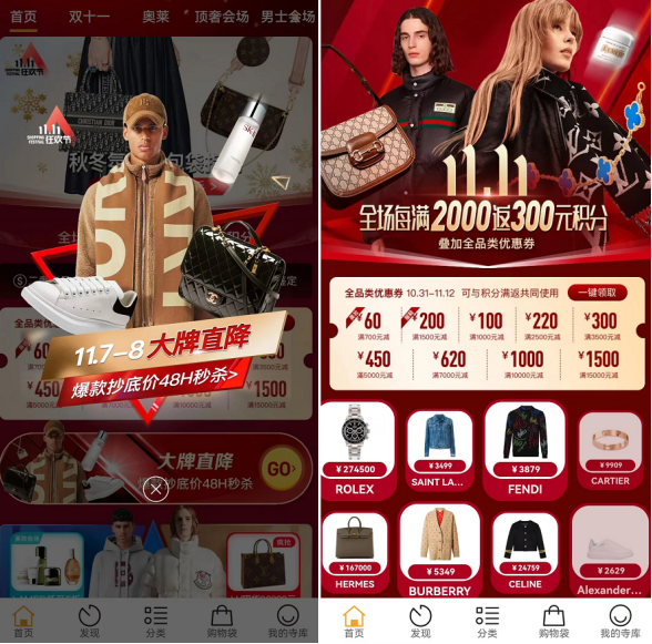 打开寺库APP,“双11”热促开屏广告占据着首页,一眼看去其与一家如火如荼的消费电商无异。