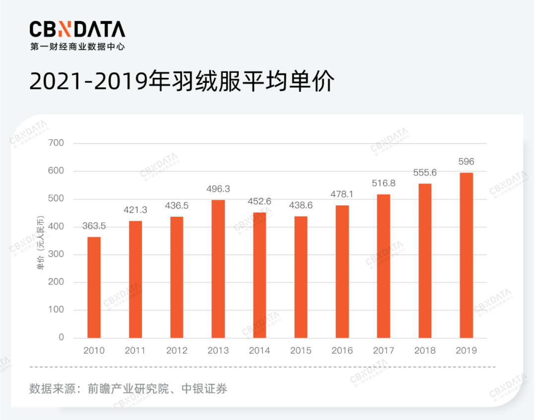 进10年来,羽绒服价格涨势惊人,2010-2019年间羽绒服均价上涨近64%,尤其是在2016-2019年间,羽绒服均价每年都有7-9%的上涨。