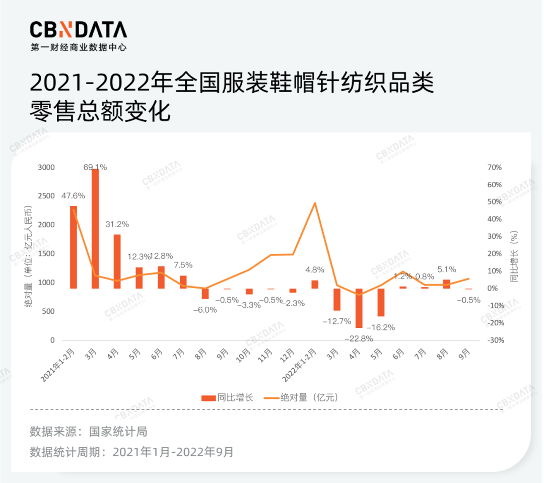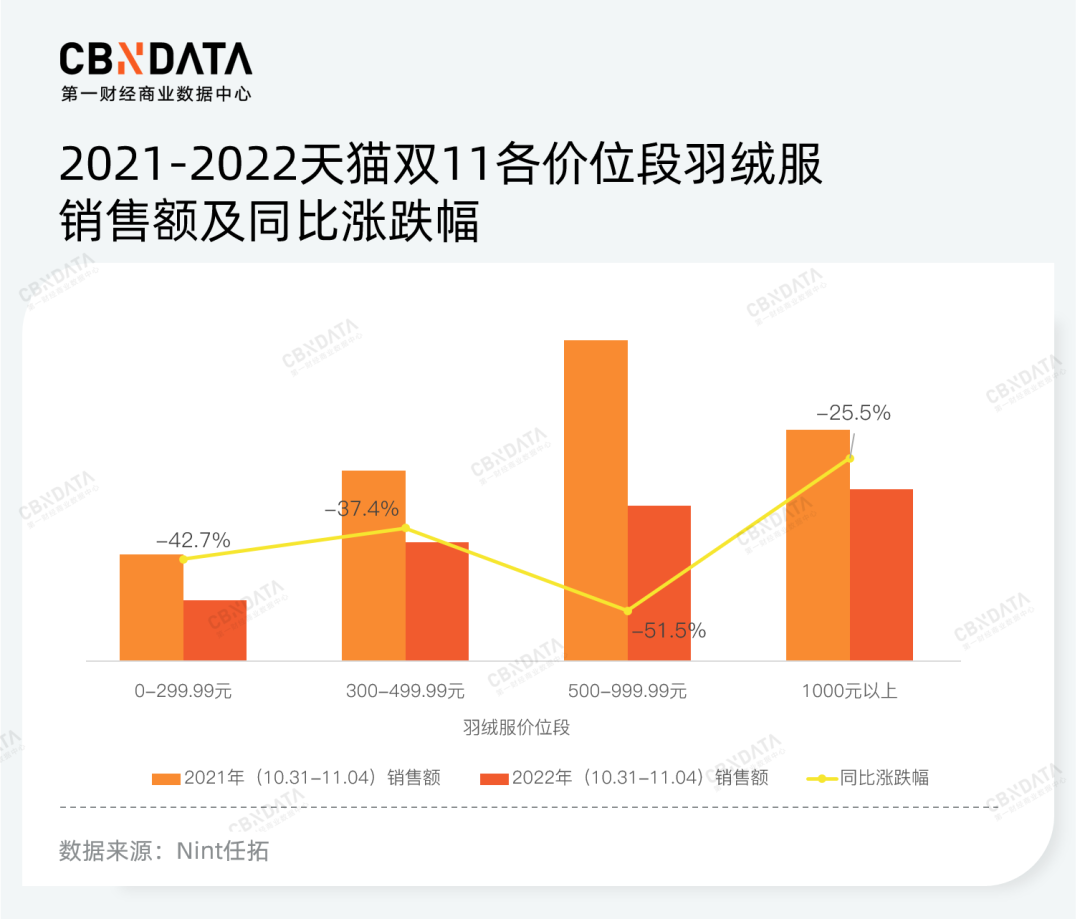 从消费端而言,相对更高的价格,意味着更优的产品品质。尤其是在疫情反复影响经济预期的背景之下,服装鞋包作为非必要消费之一,预算遭到削减——国家统计局数据显示,今年1-9月服装、鞋帽、针纺织品类的零售总额同比减少4%,分月来看,服装行业几乎每个月的销售增长情况均相当疲软。那么,在有限的预算范围内选购品质更好更耐用的产品,成为更多消费者的选择。这也是为什么今年双11羽绒服销售额整体下降,而高价位产品销量却有所拉升的原因所在。