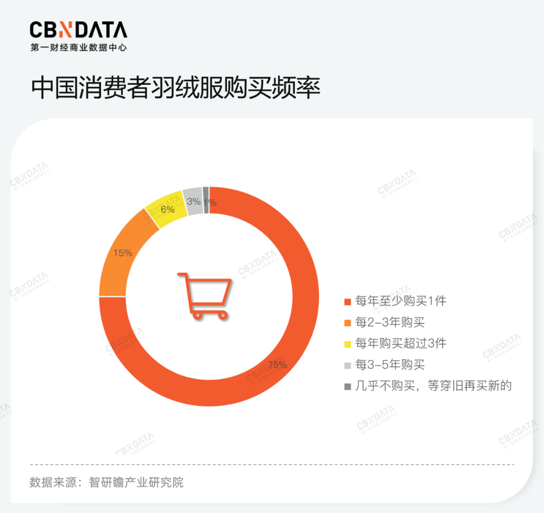 鸭鸭是“反季促销”行列中的佼佼者——“抖衣”数据显示,鸭鸭凭借39.74%的市占率,成为抖音平台今年6月反季销售的羽绒服品牌中当之无愧的TOP1。消费者的羽绒服需求量是恒定的,智研瞻产业研究院相关调研数据显示,尽管消费者的羽绒服购买频率有所提升,“每年至少购买一件羽绒服”的消费者占比高达75%,但仍有近20%的消费者每2-3年甚至3-5年购买羽绒服,一年内购买2-3次羽绒服的消费意愿并不高。对于单个品牌来说,抢在其他品牌之先,在夏天尽可能“收割”消费者的羽绒服需求,让其他品牌“无路可走”,或许是一个思路。