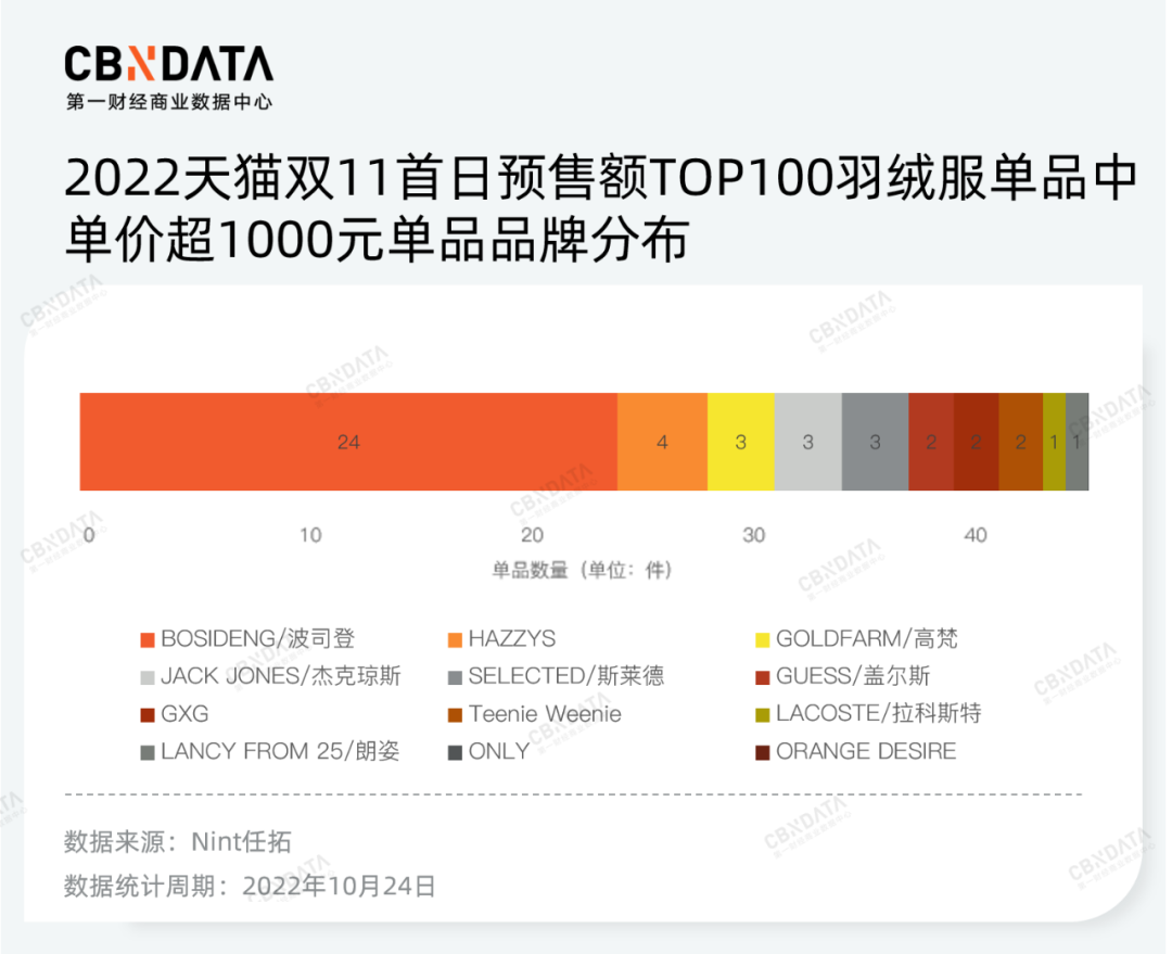 从结果来看,一系列新品的销量表现并不出色——销量最高的防晒衣、风衣羽绒服、小香风羽绒服单品,在旗舰店不过售出1000-2000件;根据Nint任拓数据,今年双11期间品牌在“运动/户外”类目的销售额也不过数百万,甚至不到服饰鞋包类目销售额的零头。但波司登试图摆脱“羽绒服”“冬季”单一标签的努力显而易见。