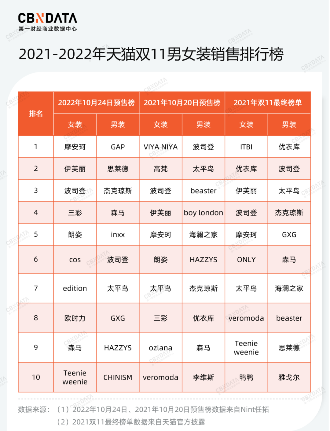 从品牌来看,VIYA NIYA、ITBT、beaster等去年表现突出的红人品牌、国潮品牌纷纷“消失”在预售TOP榜。与“消失”的品牌形成对比,羽绒服品牌波司登在男、女装品类均稳居TOP10席位。