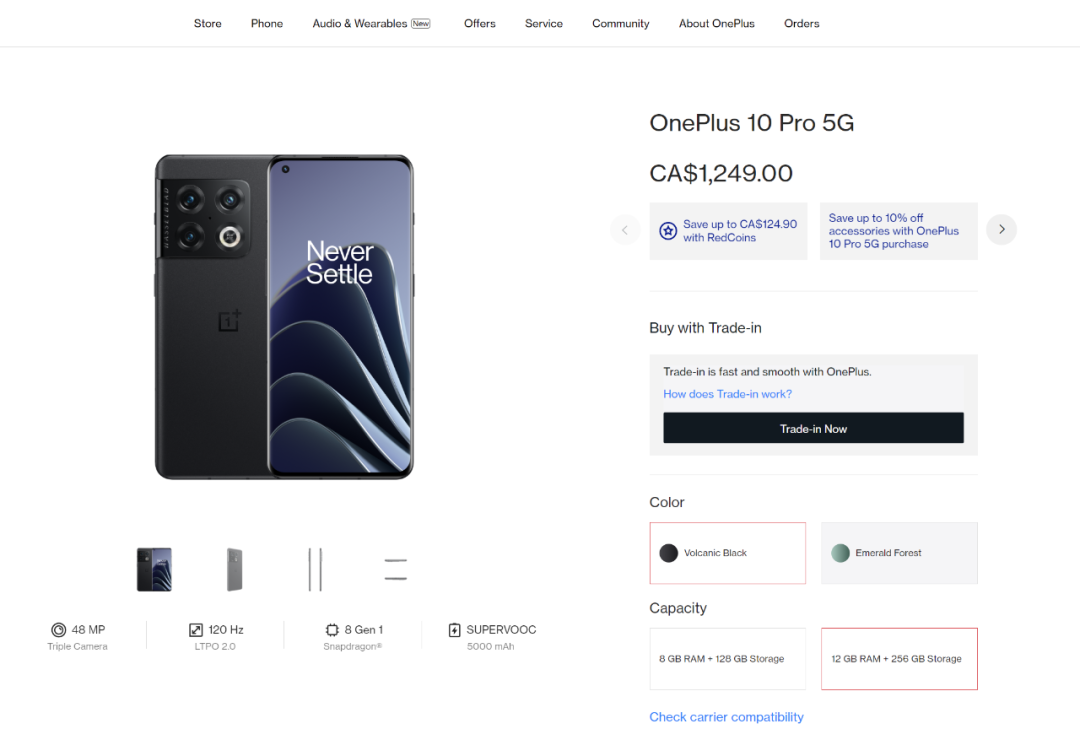 价格方面,一加10Pro在加拿大官网的售价为1249加币,约合6500元人民币,在中国官网的售价为5299元,不过在京东等电商平台的售价为4559元人民币。从单独手机的售价来看,一加在北美市场的销售价格比国内高出了30%。