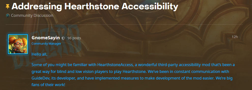 当时,一位国外大佬 GuideDev,在 Reddit 炉石社区发贴,说他为视障玩家做了款辅助插件。不含任何外挂行为,只为便利盲人朋友。