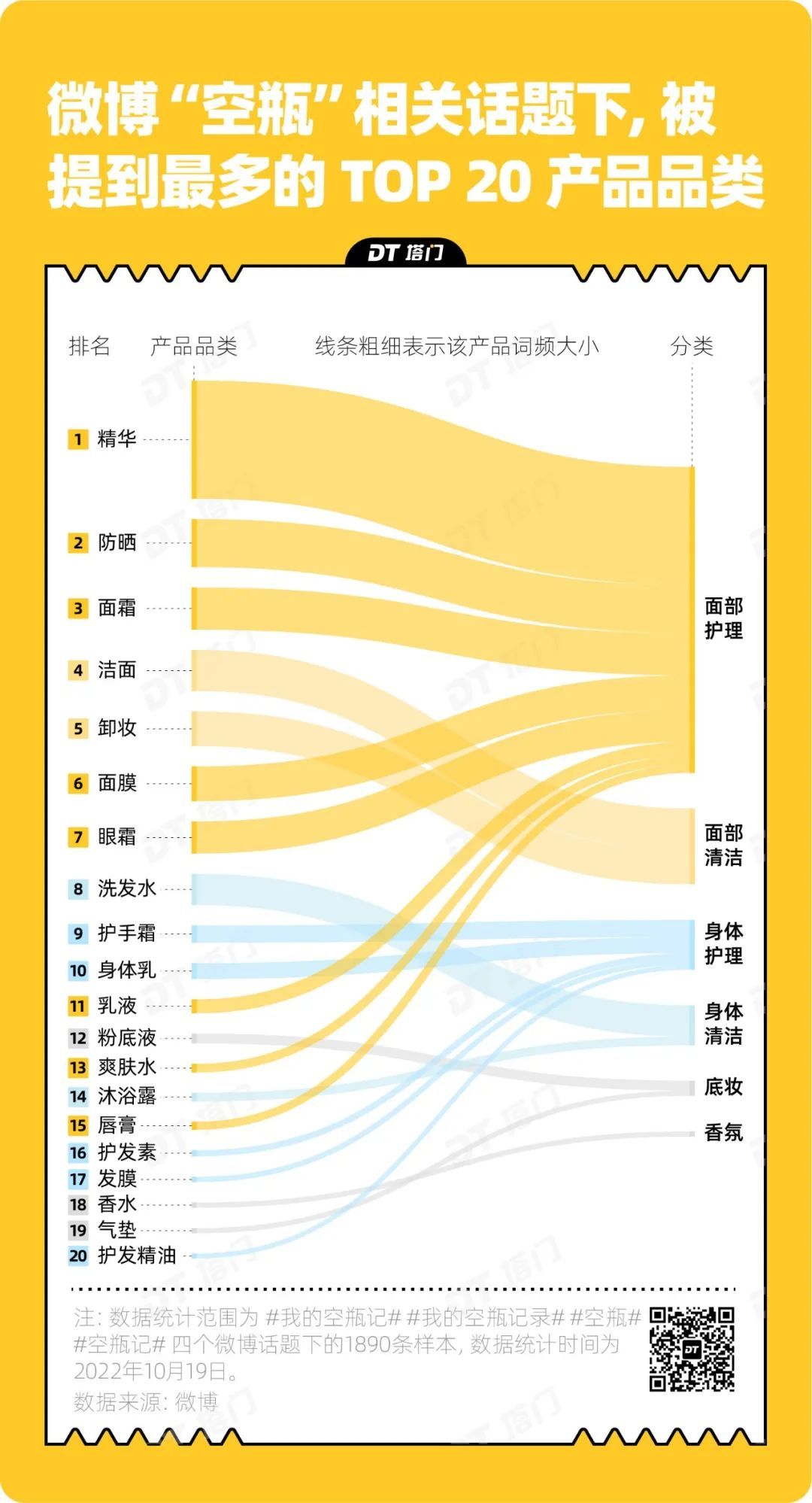 频繁购买美妆护肤品的影响,不仅体现在钱包和皮肤的变化上,还表现为空瓶越来越难。DT塔门统计了微博空瓶相关话题下的1890条内容,精华、防晒、面霜等面部护理产品被晒出最多空瓶,其次是洁面、卸妆等面部清洁用品。
