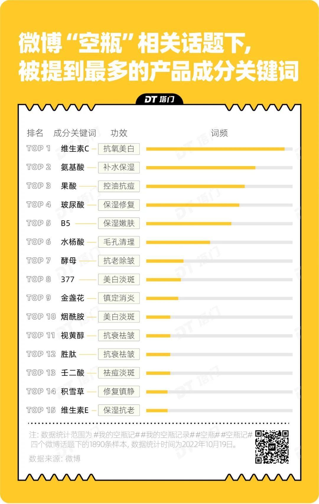 在“空瓶”相关笔记中,被提到最多的成分关键词是维生素C,其次是氨基酸、果酸,这与社交网络上的流行有关。